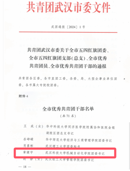 学院获评“全国钢铁行业五四红旗团委”,连续十四年获评校级“五四红旗团委”。青年志愿者服务队获批湖北省“本禹志愿服务队”,获评校级“标兵青年志愿服务组织”。暑期社会实践团队入选湖北省暑期“三下乡”社会实践重点团队。助老助残公益活动获2024年湖北省青年志愿服务“共同缔造·社区计划”竞赛专项赛铜奖。学院再次获评“优良学风学院”,学生就业率、升学率较2023年稳中有升。学生会获评校“标兵学院学生会”。