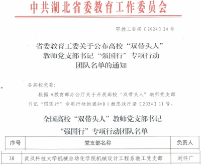 他从教近20年,担任机械国家级实验教学示范中心主任、湖北省机械设计教学研究会副理事长、湖北省机械工程学会工业自动化专委会理事。他先后获全国教师教学创新大赛一等奖、首批全国高校“双带头人”教师党支部书记工作室(负责人)、湖北省教学成果一等奖3项、国家教学成果二等奖1项;主持及参与国家科技支撑计划、国家自然科学基金等50余项,发表科研论文60余篇,授权发明专利14项,获湖北省科技进步一等奖1项、二等奖1项,中国机械工业科学技术三等奖1项;指导学生获全国大学生机械创新设计大赛等国家级奖励40余项,省级奖励60余项,指导国家级大学生创新创业项目4项,指导学生获省优学士学位论文3篇,获评湖北省优秀创新创业导师和湖北省师德先进个人。