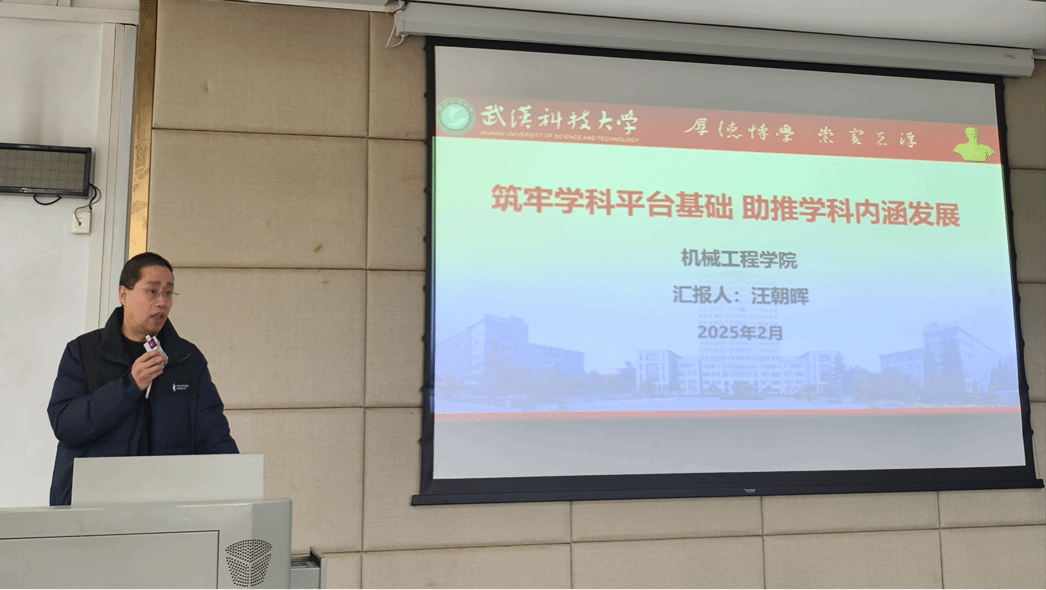 汪朝晖做了“筑牢学科平台基础,助推学科内涵发展”的工作汇报,强调要聚焦教育科技人才一体化改革,聚焦教育强国建设,聚焦中国式现代化湖北实践,把机械工程学科做大做优做强。他总结了学院“十四五”以来取得的工作成效和存在问题;要求坚持学科建设龙头地位,筑牢国家教学示范中心、教育部重点实验室和湖北省重点实验室三大学科平台基础,聚焦重点任务,坚持科学谋划,在人才培养、师资队伍、科学研究和社会服务等一流学科建设重要指标实现跨越发展;提出了学院下一阶段的主要工作任务目标,学院将继续突出优势特色、强化内涵建设,通过超常规改革创新,力争实现国家级人才、重点重大项目和科技奖励成果的突破。